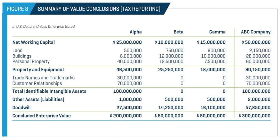 Finally, goodwill is allocated to each legal entity based on the residual value remaining after deducting the values of the net working capital, property and equipment, identified intangible assets, and other assets (liabilities) from each legal entity’s enterprise value. Given the existence of the contingent consideration for financial reporting purposes, the goodwill of the consolidated company is different for financial reporting versus tax reporting purposes (as the goodwill allocated for tax reporting purposes is limited by the initial consideration paid for the Company). Figure 8 presents the estimation of the fair market values of the tangible and intangible assets acquired by a legal entity, as of December 31, 2016, pursuant to the guidelines set forth in IRC Sections 1060 and 338.